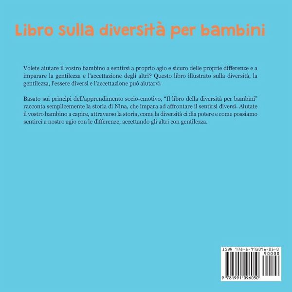 Volete aiutare il vostro bambino a sentirsi a proprio agio e sicuro delle proprie differenze e a imparare la gentilezza e l'accettazione degli altri? Questo libro illustrato sulla diversità, la gentilezza, l'essere diversi e l'accettazione può aiutarvi. Basato sui principi dell'apprendimento socio-emotivo, "Il libro della diversità per bambini" racconta semplicemente la storia di Nina, che impara ad affrontare il sentirsi diversi. Aiutate il vostro bambino a capire, attraverso la storia, come la diversità ci dia potere e come possiamo sentirci a nostro agio con le differenze, accettando gli altri con gentilezza. "Il libro della diversità per bambini" può aiutare i vostri figli: - Essere gentili con gli altri che sono diversi - Essere più sicuri di sé - Amare e accettare se stessi per quello che sono - Celebrare e accettare la diversità Acquistate subito questo libro e aiutate il vostro bambino a imparare oggi stesso!