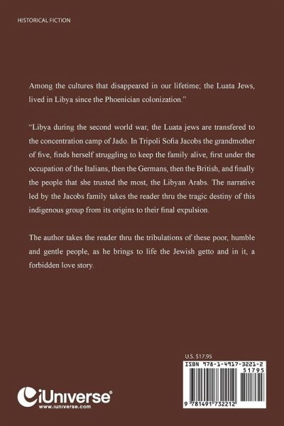 Among the cultures that disappeared in our lifetime; the Luata Jews, lived in Libya since the Phoenician colonization." "Libya during the second world war, the Luata jews are transfered to the concentration camp of Jado. In Tripoli Sofia Jacobs the grandmother of five, finds herself struggling to keep the family alive, first under the occupation of the Italians, then the Germans, then the British, and finally the people that she trusted the most, the Libyan Arabs. The narrative led by the Jacobs family takes the reader thru the tragic destiny of this indigenous group from its origins to their final expulsion. The author takes the reader thru the tribulations of these poor, humble and gentle people, as he brings to life the Jewish getto and in it, a forbidden love story.