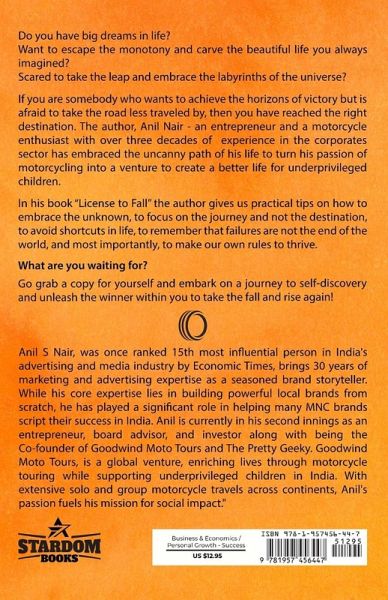 Do you have big dreams in life? "Want to escape the monotony and carve the beautiful life you always imagined?" "Scared to take the leap and embrace the labyrinths of the universe? If you are somebody who wants to achieve the horizons of victory but is afraid to take the road less travelled by, then you have reached the right destination. The author Anil Nair, an entrepreneur and a motorcycle enthusiast with over three decades of experience in the corporate sector has embraced the uncanny path of his life to turn his passion of motorcycling into a venture to create a better life for underprivileged children. In his book "License to Fall" the author gives us practical tips on how to embrace the unknown, to focus on the journey and not the destination, to avoid shortcuts in life, to remember that failures are not the end of the world, and most importantly, to make our own rules to thrive. What are you waiting for? Go grab a copy for yourself and embark on a journey to self-discovery and unleash the winner within you to take the fall and rise again!