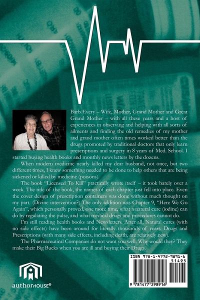 Barb Every - Wife, Mother, Grand Mother and Great Grand Mother - with all these years and a host of experiences in observing and helping with all sorts of ailments and finding the old remedies of my mother and grand mother often times worked better than the drugs promoted by traditional doctors that only learn prescriptions and surgery in 8 years of Med. School. I started buying health books and monthly news letters by the dozens. When modern medicine nearly killed my dear husband, not once, but two different times, I knew something needed to be done to help others that are being sickened or killed by medicine (poisons). The book "Licensed To Kill" practically wrote itself - it took barely over a week. The title of the book, the names of each chapter just fell into place. Even the cover design of prescription containers was done without much thought on my part. (Divine intervention?) The only addition was Chapter 9, "Here We Go Again", which personally proved, one more time, what a natural cure (iodine) can do by regulating the pulse, and what medical drugs and procedures cannot do. I'm still reading health books and Newsletters. After all, Natural cures (with no side effects) have been around for literally thousands of years. Drugs and Prescriptions (with many side effects, including death, are relatively new). The Pharmaceutical Companies do not want you well. Why would they? They make their Big Bucks when you are ill and buying their Drugs.