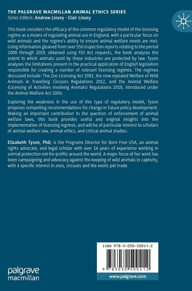 This book considers the efficacy of the common regulatory model of the licensing regime as a means of regulating animal use in England, with a particular focus on wild animals and the regime's ability to ensure animal welfare needs are met. Using information gleaned from over 550 inspection reports relating to the period 2008 through 2019, obtained using FOI Act requests, the book analyses the extent to which animals used by these industries are protected by law. Tyson analyses the limitations present in the practical application of English legislation responsible for creating a number of relevant licensing regimes.The regimes discussed include: The Zoo Licensing Act 1981, the now repealed Welfare of Wild Animals in Travelling Circuses Regulations 2012, and the Animal Welfare (Licensing of Activities Involving Animals) Regulations 2018, introduced under the Animal Welfare Act 2006.