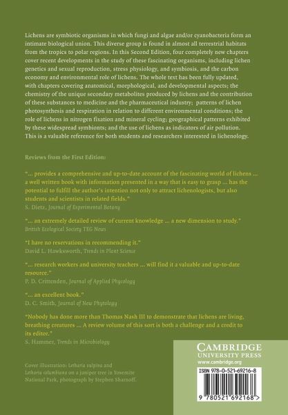 Preface T. H. Nash III 1. Introduction T. H. Nash III 2. Photobionts T. Friedl and B. Büdel 3. Mycobionts R. Honegger 4. Thallus morphology and anatomy B. Büdel and C. Scheidegger 5. Morphogenesis R. Honegger 6. Sexual reproduction in lichen-forming ascomycetes R. Honegger and S. Scherrer 7. Biochemistry and secondary metabolites J. A. Elix and E. Stocker-Wörgötter 8. Stress physiology and the symbiosis R. P. Beckett, I. Kranner and F. V. Minibayeva 9. Physiological ecology of carbon dioxide exchange T. G. A. Green, T. H. Nash III and O. L. Lange 10. The carbon economy of lichens K. Palmqvist, L. Dahlman, A. Jonsson and T. H. Nash III 11. Nitrogen, its metabolism and potential contribution to ecosystems T. H. Nash III 12. Nutrients, elemental accumulation and mineral cycling T. H. Nash III 13. Individuals and populations of lichens D. Fahselt 14. Environmental role of lichens M. R. D. Seaward 15. Lichen sensitivity to air pollution T. H. Nash III 16. Lichen biogeography D. J. Galloway 17. Systematics of lichenized fungi A. Tehler and M. Wedin Appendix. Culture methods for lichens and lichen symbionts E. Stocker-Wörgötter and A. Hager References Index.