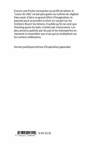 Encore une friche reconquise au profit du béton, le "coeur de ville" ne bat plus guère au rythme du végétal. Sans avoir à faire un grand effort d'imagination, le passant peut se prendre à rêver en voyant sur les trottoirs fleurir les lichens. Il oublie qu'ils ne sont que chewing-gums écrasés, crachés par insouciance. Les plus anciens, patinés par les pas et les intempéries en viennent à ressembler aux vrais qui se multiplient sur les rochers millénaires.formes poétiques brèves d'inspiration japonaise