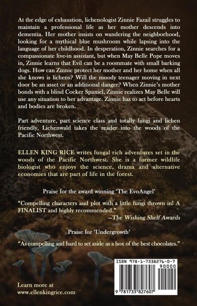 Lichenwald is the newest "mushroom thriller" from Ellen King Rice. This science-based adventure delves into the vibrant diversity of the Pacific Northwest with a story of the power in lichens and their relationships. At the edge of exhaustion, lichenologist Zinnie Fazail struggles to maintain a professional life as her mother descends into dementia. Ursula Fazail insists on wandering the neighborhood, looking for a vaguely remembered blue mushroom while lapsing into the language of her childhood. Zinnie is desperate for a home assistant who can keep up with her mother’s excursions. When May Belle Pope moves in with promises to "Take care of things," Zinnie learns that Evil can be a roommate with small barking dogs. As Ursula bonds with a blind Cocker Spaniel, Zinnie realizes May Belle will exploit any situation to her advantage. Zinnie has to act before hearts and bodies are broken, especially once May Belle has access to the home computer and family accounts. How can Zinnie protect her mother and her home when what she knows are lichens? Lichenwald includes illustrations of local lichens by Olympia artist Duncan Sheffels. Part adventure, part science class, and totally fungi and lichen friendly, Lichenwald takes the reader into a place of friendships and intertwining ecosystems.