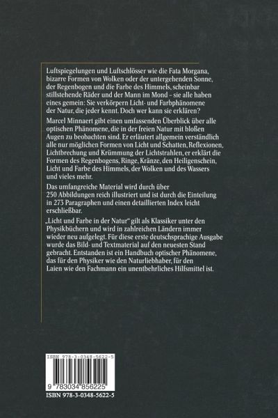 I. Licht und Schatten.- II. Die Reflexion des Lichts.- III. Die Lichtbrechung.- IV. Die Krümmung der Lichtstrahlen in der Atmosphäre.- V. Das Messen von Lichtstärke und Helligkeit.- VI. Das Auge.- VII. Die Farben.- VIII. Nachbilder und Kontrasterscheinungen.- IX. Das Beurteilen von Form und Bewegung.- X. Regenbogen, Ringe, Kränze, Heiligenschein.- XI. Licht und Farbe des Himmels.- XII. Licht und Farbe von Wolken, Wasser und festen Stoffen.- XIII. Leuchtende Pflanzen, Tiere und Steine.- A. Das Fotografieren von Naturerscheinungen.- B. Das Messen von Winkeln in der Landschaft.- C. Abkürzungen.- D. Index.
