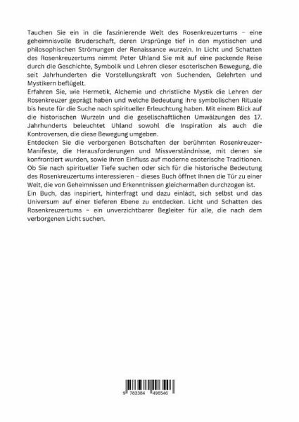 Tauchen Sie ein in die faszinierende Welt des Rosenkreuzertums - eine geheimnisvolle Bruderschaft, deren Ursprünge tief in den mystischen und philosophischen Strömungen der Renaissance wurzeln. In Licht und Schatten des Rosenkreuzertums nimmt Peter Uhland Sie mit auf eine packende Reise durch die Geschichte, Symbolik und Lehren dieser esoterischen Bewegung, die seit Jahrhunderten die Vorstellungskraft von Suchenden, Gelehrten und Mystikern beflügelt.Erfahren Sie, wie Hermetik, Alchemie und christliche Mystik die Lehren der Rosenkreuzer geprägt haben und welche Bedeutung ihre symbolischen Rituale bis heute für die Suche nach spiritueller Erleuchtung haben. Mit einem Blick auf die historischen Wurzeln und die gesellschaftlichen Umwälzungen des 17. Jahrhunderts beleuchtet Uhland sowohl die Inspiration als auch die Kontroversen, die diese Bewegung umgeben.Entdecken Sie die verborgenen Botschaften der berühmten Rosenkreuzer-Manifeste, die Herausforderungen und Missverständnisse, mit denen sie konfrontiert wurden, sowie ihren Einfluss auf moderne esoterische Traditionen. Ob Sie nach spiritueller Tiefe suchen oder sich für die historische Bedeutung des Rosenkreuzertums interessieren - dieses Buch öffnet Ihnen die Tür zu einer Welt, die von Geheimnissen und Erkenntnissen gleichermaßen durchzogen ist.Ein Buch, das inspiriert, hinterfragt und dazu einlädt, sich selbst und das Universum auf einer tieferen Ebene zu entdecken. Licht und Schatten des Rosenkreuzertums - ein unverzichtbarer Begleiter für alle, die nach dem verborgenen Licht suchen.