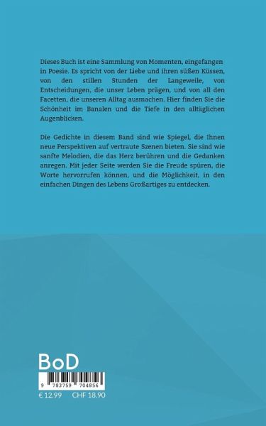 Dieses Buch ist eine Sammlung von Momenten, eingefangen in Poesie. Es spricht von der Liebe und ihren süßen Küssen, von den stillen Stunden der Langeweile, von Entscheidungen, die unser Leben prägen, und von all den Facetten, die unseren Alltag ausmachen. Hier finden Sie die Schönheit im Banalen und die Tiefe in den alltäglichen Augenblicken.Die Gedichte in diesem Band sind wie Spiegel, die Ihnen neue Perspektiven auf vertraute Szenen bieten. Sie sind wie sanfte Melodien, die das Herz berühren und die Gedanken anregen. Mit jeder Seite werden Sie die Freude spüren, die Worte hervorrufen können, und die Möglichkeit, in den einfachen Dingen des Lebens Großartiges zu entdecken.