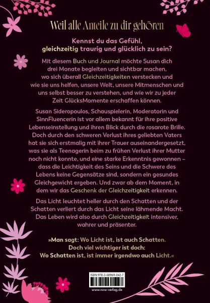 Susan Sideropoulos - Schauspielerin, Moderatorin und Sinnfluencerin - ist vor allem bekannt für ihre positive Lebenseinstellung und ihren Blick durch die rosarote Brille. Doch durch den schweren Verlust ihres geliebten Vaters hat sie sich erstmals intensiv mit ihrer Trauer auseinandergesetzt - etwas, das ihr beim frühen Verlust ihrer Mutter in der Teenagerzeit noch nicht möglich war. Dabei gewann sie eine starke Erkenntnis: Die Leichtigkeit des Seins und die Schwere des Lebens sind keine Gegensätze, sondern ergeben ein gesundes Gleichgewicht - ab dem Moment, in dem wirdas Geschenk der Gleichzeitigkeit erkennen.