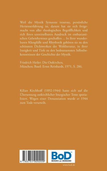 Weil die Mystik Symeons innerste, persönliche Herzenserfahrung ist, darum hat sie sich freigemacht von aller theologischen Begrifflichkeit und sich ihren unmittelbaren Ausdruck im enthusiastischen Gebetshymnus geschaffen ... In ihrer wunderbaren Klangfülle und Rhythmik gehören sie zu den schönsten Dichtwerken der Weltliteratur, in ihrer Innigkeit und Tiefe zu den bedeutsamsten Selbstbekenntnissen der Geschichte der Mystik.Friedrich Heiler: Die Ostkirchen, München, Basel 1971, S. 286.Der Übersetzer Kilian Kirchhoff (1892-1944) hatte sich auf die Übertragung ostkirchlicher liturgischer Texte spezialisiert. Wegen einer Denunziation wurde er 1944 zum Tode verurteilt.