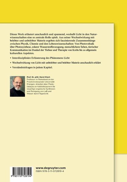 Dieses Werk erläutert anschaulich und spannend, weshalb Licht in den Naturwissenschaften eine so zentrale Rolle spielt. Aus der Wechselwirkung von Licht mit belebter und unbelebter Materie ergeben sich faszinierende Zusammenhänge zwischen Physik, Chemie und den Lebenswissenschaften. Von Photovoltaik über Photosynthese bis zur solaren Wasserstofferzeugung werden die zugrundeliegenden physikalisch-chemischen Prinzipien behandelt.