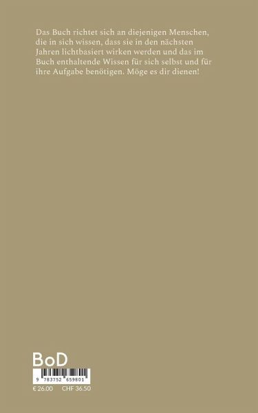 Das Buch richtet sich an diejenigen Menschen, die in sich wissen, dass sie in den nächsten Jahren lichtbasiert wirken werden und das im Buch enthaltende Wissen für sich selbst und für ihre Aufgabe benötigen. Möge es dir dienen!