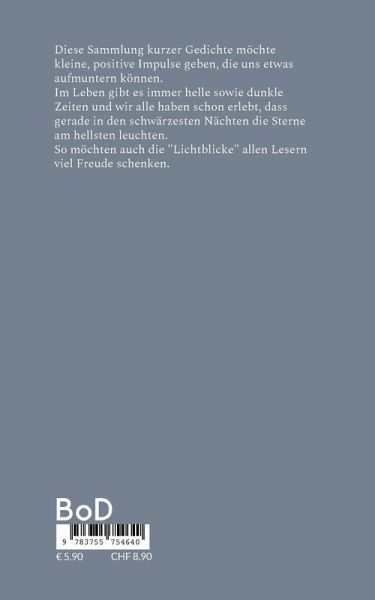 Diese Sammlung kurzer Gedichte möchte kleine, positive Impulse geben, die uns etwas aufmuntern können. Im Leben gibt es immer helle sowie dunkle Zeiten und wir alle haben schon erlebt, dass gerade in den schwärzesten Nächten die Sterne am hellsten leuchten.So möchten auch die Lichtblicke allen Lesern viel Freude schenken.Herausgeber: Hans-Jürgen Sträter, Adlerstein Verlag