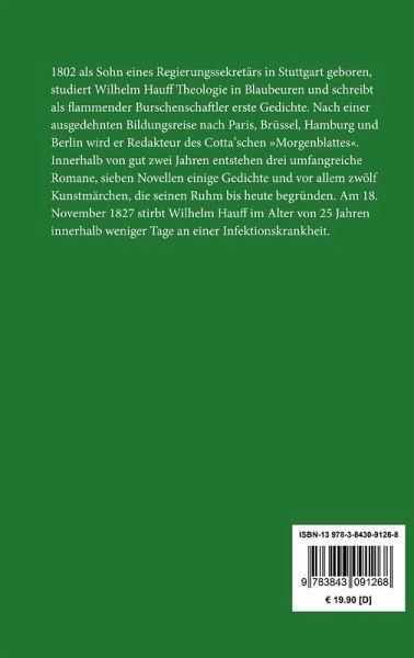 1802 als Sohn eines Regierungssekretärs in Stuttgart geboren, studiert Wilhelm Hauff Theologie in Blaubeuren und schreibt als flammender Burschenschaftler erste Gedichte. Nach einer ausgedehnten Bildungsreise nach Paris, Brüssel, Hamburg und Berlin wird er Redakteur des Cotta'schen "Morgenblattes". Innerhalb von gut zwei Jahren entstehen drei umfangreiche Romane, sieben Novellen einige Gedichte und vor allem zwölf Kunstmärchen, die seinen Ruhm bis heute begründen. Am 18. November 1827 stirbt Wilhelm Hauff im Alter von 25 Jahren innerhalb weniger Tage an einer Infektionskrankheit.