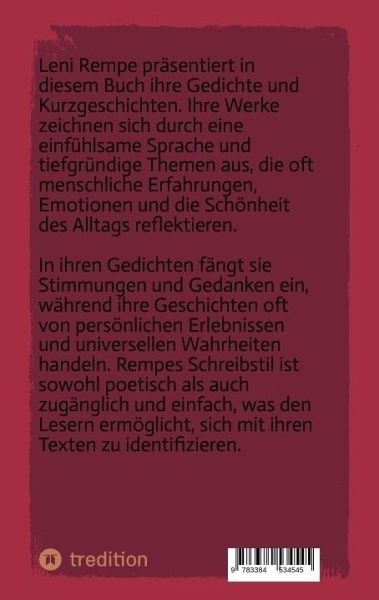Gedichte und Geschichten aus dem alltäglichen Leben. Gedanken und Gefühle werden eingefangen und kritische Themen wie Krieg, Liebe und Zukunft werden verarbeitet.