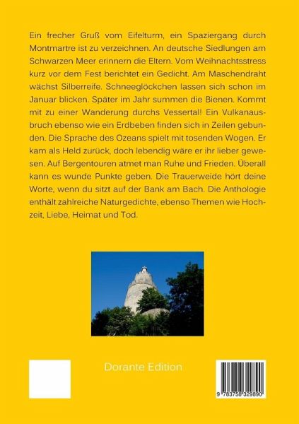 Ein frecher Gruß vom Eifelturm, ein Spaziergang durch Montmartre ist zu verzeichnen. An deutsche Siedlungen am Schwarzen Meer erinnern die Eltern. Vom Weihnachtsstress kurz vor dem Fest berichtet ein Gedicht. Am Maschendraht wächst Silberreife. Schneeglöckchen lassen sich schon im Januar blicken. Später im Jahr summen die Bienen. Kommt mit zu einer Wanderung durchs Vessertal! Ein Vulkanausbruch ebenso wie ein Erdbeben finden sich in Zeilen gebunden. Die Sprache des Ozeans spielt mit tosenden Wogen. Er kam als Held zurück, doch lebendig wäre er ihr lieber gewesen. Auf Bergentouren atmet man Ruhe und Frieden. Überall kann es wunde Punkte geben. Die Trauerweide hört deine Worte, wenn du sitzt auf der Bank am Bach. Die Anthologie enthält zahlreiche Naturgedichte, ebenso Themen wie Hochzeit, Liebe, Heimat und Tod.