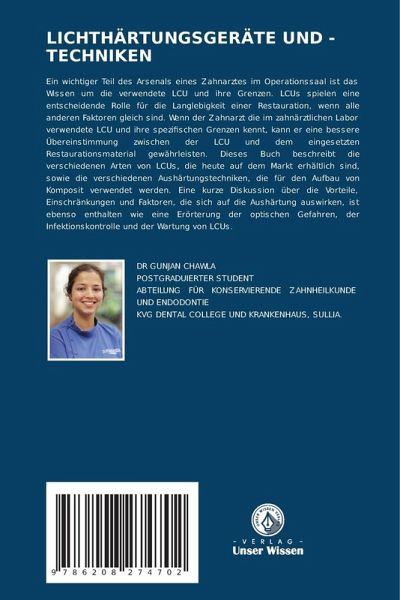 Ein wichtiger Teil des Arsenals eines Zahnarztes im Operationssaal ist das Wissen um die verwendete LCU und ihre Grenzen. LCUs spielen eine entscheidende Rolle für die Langlebigkeit einer Restauration, wenn alle anderen Faktoren gleich sind. Wenn der Zahnarzt die im zahnärztlichen Labor verwendete LCU und ihre spezifischen Grenzen kennt, kann er eine bessere Übereinstimmung zwischen der LCU und dem eingesetzten Restaurationsmaterial gewährleisten. Dieses Buch beschreibt die verschiedenen Arten von LCUs, die heute auf dem Markt erhältlich sind, sowie die verschiedenen Aushärtungstechniken, die für den Aufbau von Komposit verwendet werden. Eine kurze Diskussion über die Vorteile, Einschränkungen und Faktoren, die sich auf die Aushärtung auswirken, ist ebenso enthalten wie eine Erörterung der optischen Gefahren, der Infektionskontrolle und der Wartung von LCUs.
