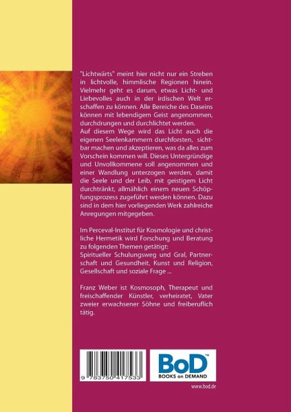 "Lichtwärts" meint hier nicht nur ein Streben in lichtvolle, himm-lische Regionen hinein. Vielmehr geht es darum, etwas Licht- und Liebevolles auch in der irdischen Welt erschaffen zu können. Alle Bereiche des Daseins können mit lebendigem Geist durchdrungen, angenommen und durchlichtet werden.Auf diesem Wege muss das Licht auch die eigenen Seelenkammern durchforsten, sichtbar machen und akzeptieren, was da alles an Verborgenem zum Vorschein kommen will. Dieses Untergründige und Unvollkommene soll angenommen und einer Wandlung unterzogen werden, damit Seele und Leib mit geistigem Licht durchtränkt, allmählich einem neuen Schöpfungsprozess zugeführt werden können.Dazu sind in dem hier vorliegenden Werk zahlreiche Anregungen mitgegeben.