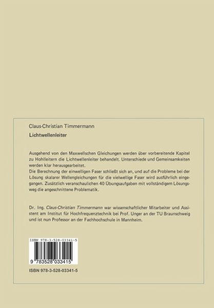 daktischen GrUnden und wegen der allgemeinen Bedeutung der Hohlleiter steht den Betrachtungen zu Lichtwellenleitern, die 3/4 des Raumes einnehmen, ein vorbereitendes Kapitel Uber Hohlleiter voran. Dabei ergeben sich gute Moglichkeiten, Gemeinsamkeiten und Unterschiede zwischen Hohlleitern und Glasfasern herauszuarbeiten. Das Kapitel der Lichtwellenleiter beginnt mit der bei Hohlleitern nicht vorkommenden Materialdispersion und mit einem Abschnitt Uber Reflexion ebener Wellen an Grenzschichten. Nahtlos fUgt sich dann die Berechnung der einwelligen Faser mit den exakten und ge naherten Wellen den Betrachtungen im Rundhohlleiter an, wobei nun zusatz lich das dispersive Material berUcksichtigt wird. Die Berechnung der viel welligen Fasern wird dann mit der WKB-Methode eingeleitet, die relativ un bekannt ist und hier etwas ausfUhrlicher besprochen wird. Diese Methode stellt auch gleichzeitig eine Verbindung zur geometrischen Optik her und vertieft auf diese Weise das Verstandnis. AbschlieBend kommen die Licht einkopplung, Dampfung und technische AusfUhrungsformen zur Sprache. Urn den Text Ubersichtlich zu gestalten, wurden einige Detailfragen und viele praktische Probleme in etwa 40 Obungsaufgaben verlagert, fUr die die voll standige Losung angegeben ist. Dem Leser wird unbedingt empfohlen, diese Aufgaben se 1 bs ts tandi 9 zu 1 osen; di e Losungen so 11 en nur zur Kontro 11 e herangezogen werden. Weite Teile dieses Textes und der Obungsaufgaben sind aus einer entspr- chenden Vorlesung hervorgegangen, wie sie an der Fachhochschule fUr Technik in Mannheim fUr Studierende der Nachrichtentechnik gehalten wird.
