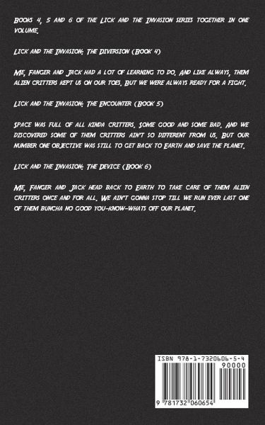 Aliens vs Southern Boys Science Fiction and Southern Humor Mashup Books 4, 5 and 6 of the Lick and the Invasion series together in one volume. Lick and the Invasion: The Diversion (Book 4) Me, Fanger and Jack had a lot of learning to do. And like always, them alien critters kept us on our toes. But we were always ready for a fight. Lick and the Invasion: The Encounter (Book 5) Space was full of all kinda critters. Some good and some bad. And we discovered some of them critters ain't so different from us. But our number one objective was still to get back to Earth and save the planet. Lick and the Invasion: The Device (Book 6) Me, Fanger and Jack head back to Earth to take care of them alien critters once and for all. We ain't gonna stop till we run ever last one of them buncha no good you-know-whats off our planet.