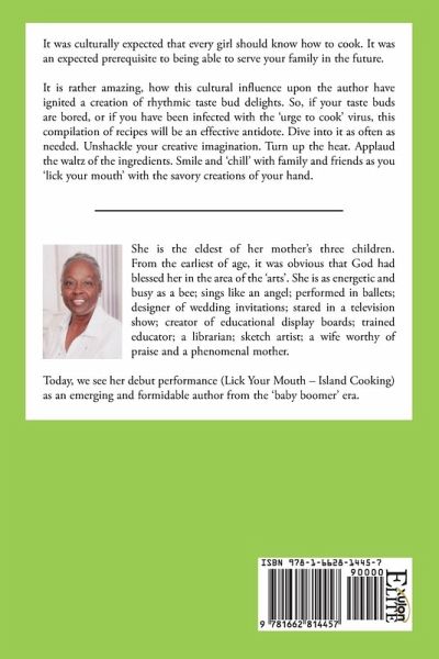 It was culturally expected that every girl should know how to cook. It was an expected prerequisite to being able to serve your family in the future.It is rather amazing, how this cultural influence upon the author have ignited a creation of rhythmic taste bud delights. So, if your taste buds are bored, or if you have been infected with the 'urge to cook' virus, this compilation of recipes will be an effective antidote. Dive into it as often as needed. Unshackle your creative imagination. Turn up the heat. Applaud the waltz of the ingredients. Smile and 'chill' with family and friends as you 'lick your mouth' with the savory creations of your hand. She is the eldest of her mother's three children.From the earliest of age, it was obvious that God had blessed her in the area of the 'arts'. She is as energetic and busy as a bee; sings like an angel; performed in ballets; designer of wedding invitations; stared in a television show; creator of educational display boards; trained educator; a librarian; sketch artist; a wife worthy of praise and a phenomenal mother.Today, we see her debut performance (Lick Your Mouth - Island Cooking) as an emerging and formidable author from the 'baby boomer' era.