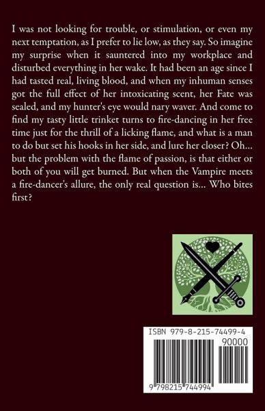 I was not looking for trouble, or stimulation, or even my next temptation, as I prefer to lie low, as they say. So imagine my surprise when it sauntered into my workplace and disturbed everything in her wake. It had been an age since I had tasted real, living blood, and when my inhuman senses got the full effect of her intoxicating scent, her Fate was sealed, and my hunter's eye would nary waver. And come to find my tasty little trinket turns to fire-dancing in her free time just for the thrill of a licking flame, and what is a man to do but set his hooks in her side, and lure her closer? Oh... but the problem with the flame of passion, is that either or both of you will at somw poinr get burned. But when the Vampire meets a fire-dancer's allure, the only real question is... Who bites first?