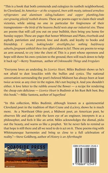 Never forget where you come from, kid... so says the voice in the poet's head. And so it is that the poet drinks deep of that inexhaustible well, surveying the varied landscapes of inner and outer spaces. The rustbelt factories where one marks time while dreaming of other worlds, ear to the polishing stone that grinds away history, flints of flea market treasures. And amid the slow churn of decay and despair, to still hear America singing, fighting, surviving; daring, even, to hope for sparks that ignite the licorice hearts all across this fallen world, of a love that might save us all. "This is a book that both commends and eulogizes its rustbelt neighborhood, its Cleveland, its America- at the scrapyard, /men with meaty, tattooed arms/toss refrigerators and aluminum siding,/radiators and copper plumbing,/into ever-growing piles/of rustbelt dreams. These are poems eager to claim their small victories, while asking no one in particular for forgiveness of their transgressions-the birds of the heavens /build nests atop our industrial sins. These are poems that will call you out on your bullshit, then bring you home for Sunday supper. These are pages that honor Whitman and Plato, riverbeds and asphalt, patriotism and protest, love and death, and loyalty to books and friendship. I strain, looking/under streetlights,/see nothing but/drowsy suburbs,/pregnant with/all these love affairs/about to fail. These are poems to wrap an arm around, to cry into the chest of. This is a poet whose openness and hope will shove his own cynicism to the ground, then will reach down to help it back up."-Kerry Trautman, author of Unknowable Things and Irregulars "Everyone loves an underdog. In Licorice Heart, Miles Budimir shows us he's not afraid to dust knuckles with the bullies and cynics. The national conversation surrounding the poet's beloved Midwest has always been at least twice as toxic as any river in the region. He's not buying it. And you shouldn't either. A love letter to the rubble around the flower - a recipe for rendering the cheap cuts delicious - Licorice Heart is Budimir at his Rust Belt best. Buy this book."-Mike Santora, author of Sugarflood "In this collection, Miles Budimir, although known as a quintessential Cleveland poet in the tradition of Hart Crane and d.a.levy, shows he is much more. As a Northeast Ohio poet, a Midwest poet, an American poet, he observes life and place with the keen eye of an engineer, interprets it as a philosopher, and feels it like an artist. Miles acknowledges the dismal, picks out the beauty, and warns us like a prophet. Yet he never fails to remind us that hope is still there and all we need to do is act on it. These poems ring with Whitmanesque harmonies and bring us close to a full celebration of reality."-Steve Goldberg, author of History is an Afterthought