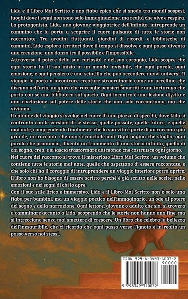 Lida e il Libro Mai Scritto è una fiaba epica che si snoda tra mondi sospesi, luoghi dove i sogni non sono solo immaginazione, ma realtà che vive e respira. La protagonista, Lida, una giovane viaggiatrice dell'infinito, intraprende un cammino che la porta a scoprire il cuore pulsante di tutte le storie non raccontate. Tra gradini fluttuanti, giardini di ricordi, e biblioteche di cammini, Lida esplora territori dove il tempo si dissolve e ogni passo diventa una creazione, una danza tra il possibile e l'impossibile. Attraverso il potere della sua curiosità e del suo coraggio, Lida scopre che ogni storia ha il suo inizio in un mondo invisibile, che ogni parola, ogni emozione, e ogni pensiero è una scintilla che può accendere nuovi universi. Il viaggio la porta a incontrare creature straordinarie come un uccellino che disegna nell'aria, un ghiro che raccoglie pensieri smarriti e una tartaruga che porta con sé una biblioteca sul guscio. Ogni incontro è una lezione di vita e una rivelazione sul potere delle storie che non solo raccontiamo, ma che viviamo. Il culmine del viaggio si svolge nel cuore di una piazza di specchi, dove Lida si confronta con le versioni di sé stessa, quelle passate, quelle future, e quelle mai nate, comprendendo finalmente che la sua vita è parte di un racconto più grande, un racconto che non si conclude mai. Ogni pagina che sfoglia, ogni parola che pronuncia, diventa un frammento di una storia infinita, quella di chi sogna, crea, e si lascia trasformare dal mondo che costruisce ogni giorno. Nel cuore del racconto si trova il misterioso Libro Mai Scritto, un volume che contiene tutte le storie mai nate, quelle che aspettano di essere raccontate, e che solo chi ha il coraggio di intraprendere un viaggio interiore potrà aprire. Il libro non ha bisogno di essere scritto perché è già scritto nelle scelte, nelle emozioni e nei sogni di chi lo apre. Con il suo stile lirico e immersivo, Lida e il Libro Mai Scritto non è solo una fiaba per bambini, ma un viaggio poetico nell'immaginario, un'ode al potere del sogno e della narrazione. Ogni lettore, giovane o adulto che sia, si troverà a camminare accanto a Lida, scoprendo che le storie non hanno una fine, ma si intrecciano senza mai smettere di crescere. Un libro che celebra la bellezza dell'inesauribile, che ci ricorda che ogni passo verso l'ignoto è in realtà un passo verso noi stessi.