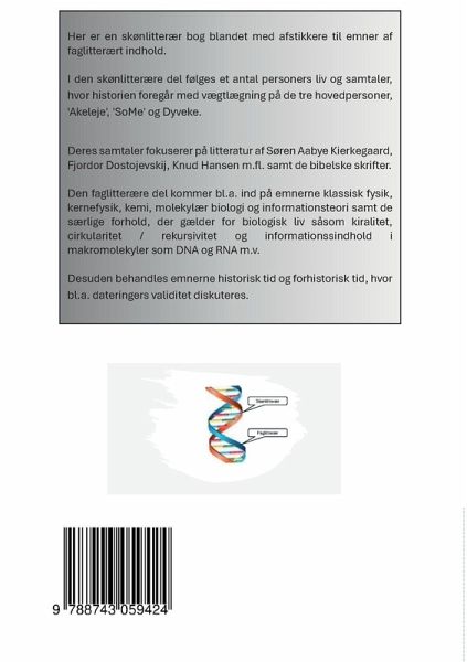 Her er en skønlitterær bog blandet med afstikkere til emner af faglitterært indhold. I den skønlitterære del følges et antal personers liv og samtaler, hvor historien foregår med vægtlægning på de tre hovedpersoner, 'Akeleje', 'SoMe' og Dyveke. Deres samtaler fokuserer på litteratur af Søren Aabye Kierkegaard, Fjordor Dostojevskij, Knud Hansen m.fl. samt de bibelske skrifter. Den faglitterære del kommer bl.a. ind på emnerne klassisk fysik, kernefysik, kemi, molekylær biologi og informationsteori samt de særlige forhold, der gælder for biologisk liv såsom kiralitet, cirkularitet / rekursivitet og informationssindhold i makromolekyler som DNA og RNA m.v. Desuden behandles emnerne historisk tid og forhistorisk tid, hvor bl.a. dateringers validitet diskuteres.