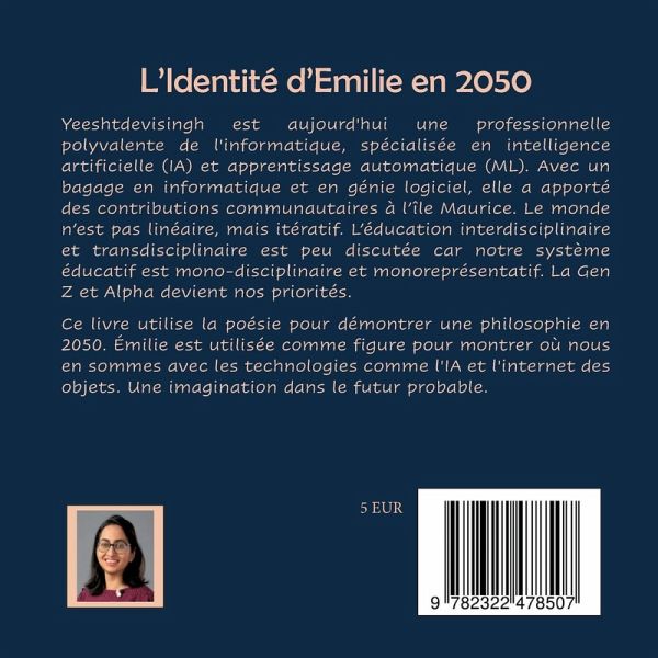Le monde n'est pas lineaire, mais iteratif. L'éducaiton interdisciplinaire et transdisciplinaire est peu discutée car notre systeme educatif est mono-disciplinaire et monoreprésentatif. La Gen z et Gen Alpha devient nos priorités. Ce livre utlise la poésie pour démontrer une philosophie en 2050. Emilie est utlisée comme figure pour montrer ou nous en sommes avec les technologies comme L'intelligence Artificielle et L'internet des Objects (IoT, Internet of Things) Une Imagination dans le futur probable. 5 gros chapitres et des sous chapitres se listent comme: 1. Emilie en Famille 1.1. Le cri d'un bébé aujourd'hui 1.2. Le cris d'un bébé a l'avenir 1.3. Emilie, le bébé en Maman 1.4. Emilie, la maman en bébé 1.5. Emilie et la TV en famille 2. Emilie a l'école 2.1. L'identité d'un cahier 2.2. L'identité du crayon 2.3. L'identité du sac écolier 3. Emilie dans son environnement 3.1. Changement Climatique 3.2. Les Poubelles 3.3. Des Bicyclettes 4. Emilie pour l'économie 4.1. Une économie SciArt 4.2. Une économie de dialogue 4.3. Emilie achete 5. Emilie a la mode 5.1. Les T-shirt graphiques 5.2. Les T-shirt lexiques et graphiques 5.3. Le coton