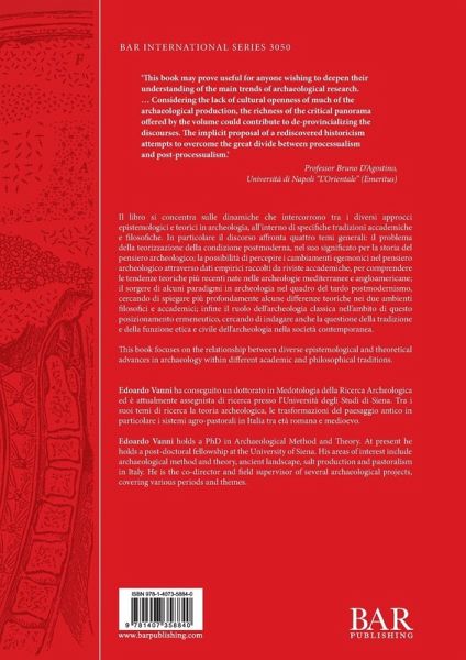 Il libro si concentra sulle dinamiche che intercorrono tra i diversi approcci epistemologici e teorici in archeologia, all'interno di specifiche tradizioni accademiche e filosofiche. In particolare il discorso affronta quattro temi generali: il problema della teorizzazione della condizione postmoderna, nel suo significato per la storia del pensiero archeologico; la possibilità di percepire i cambiamenti egemonici nel pensiero archeologico attraverso dati empirici raccolti da riviste accademiche, per comprendere le tendenze teoriche più recenti nate nelle archeologie mediterranee e anglo-americane; il sorgere di alcuni paradigmi in archeologia nel quadro del tardo postmodernismo, cercando di spiegare più profondamente alcune differenze teoriche nei due ambienti filosofici e accademici; infine il ruolo dell'archeologia classica nell'ambito di questo posizionamento ermeneutico, cercando di indagare anche la questione della tradizione e della funzione etica e civile dell'archeologia nella società contemporanea. This book focuses on the relationship between diverse epistemological and theoretical advances in archaeology within different academic and philosophical traditions.