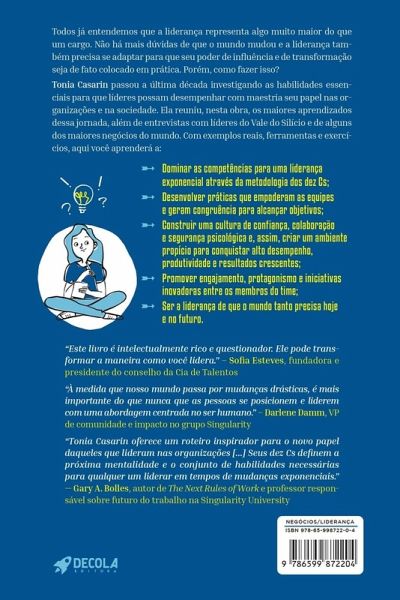 Todos já entendemos que a liderança representa algo muito maior do que um cargo. Não há mais dúvidas de que o mundo mudou e a liderança também precisa se adaptar para que seu poder de influência e de transformação realmente seja colocado em prática. Porém, como fazer isso? Tonia Casarin passou a última década investigando as habilidades essenciais para que líderes possam desempenhar com maestria seu papel nas organizações e na sociedade. Ela reuniu os maiores aprendizados dessa jornada, além de entrevistas com líderes do Vale do Silício e de alguns dos maiores negócios do mundo, nesta obra. Com exemplos reais, ferramentas e exercícios, aqui você aprenderá a: ¿ Dominar as competências para uma liderança exponencial através da metodologia dos dez Cs; ¿ Desenvolver práticas que empoderam as equipes e geram congruência para alcançar objetivos; ¿ Construir uma cultura de confiança, colaboração e segurança psicológica e, assim, criar um ambiente propício para conquistar alto desempenho, produtividade e resultados crescentes; ¿ Promover o engajamento, o protagonismo e iniciativas inovadoras entre os membros do time; ¿ Ser a liderança de que o mundo tanto precisa hoje e no futuro.