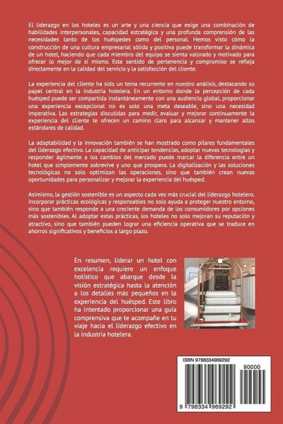 Descripción: Descubre las claves del éxito en la industria hotelera con "Liderazgo en los Hoteles: Estrategias para la Excelencia". Este libro es una guía esencial para gerentes, líderes y cualquier persona interesada en el apasionante mundo de la hospitalidad. A través de sus páginas, explorarás cómo establecer una visión clara, construir una cultura empresarial sólida y ofrecer una experiencia del cliente excepcional. Características Destacadas: * Visión y Estrategia: Aprende a crear y comunicar una visión inspiradora que guíe a tu equipo hacia la excelencia. * Cultura Empresarial: Descubre cómo desarrollar una cultura organizacional que fomente la innovación, la colaboración y el compromiso del personal. * Experiencia del Cliente: Implementa estrategias efectivas para mejorar la satisfacción y lealtad de tus huéspedes, garantizando experiencias memorables. * Innovación Tecnológica: Explora cómo las últimas tecnologías pueden optimizar las operaciones y personalizar el servicio en tu hotel. * Sostenibilidad: Conoce las mejores prácticas de gestión sostenible para reducir el impacto ambiental y mejorar la eficiencia operativa. Beneficios de este Libro: * Para Líderes Actuales y Futuros: Ideal para gerentes de hotel y aquellos que aspiran a posiciones de liderazgo en la industria hotelera. * Casos Prácticos: Incluye estudios de caso reales y ejemplos prácticos que ilustran los conceptos y estrategias presentadas. * Herramientas y Técnicas: Proporciona herramientas prácticas y técnicas de gestión que puedes aplicar de inmediato en tu hotel. Este libro no es solo una fuente de conocimiento, sino una inspiración para aquellos que desean marcar la diferencia en la hospitalidad. Al leer "Liderazgo en los Hoteles: Estrategias para la Excelencia", estarás un paso más cerca de convertirte en un líder destacado y llevar tu hotel a nuevas alturas.