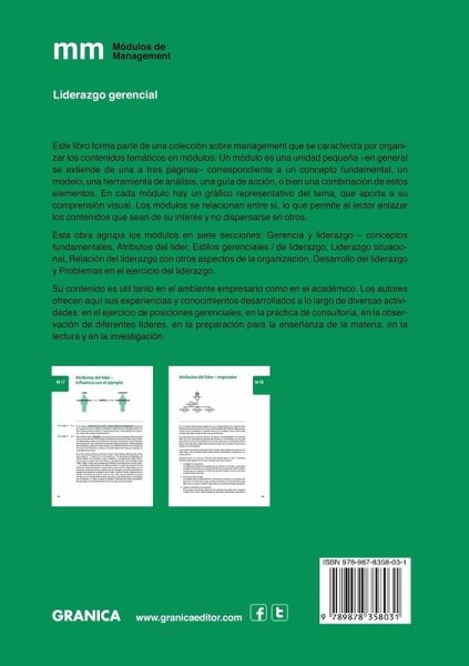 Este libro forma parte de una colección sobre management que se caracteriza por organizar los contenidos temáticos en módulos. Un módulo es una unidad pequeña -en general se extiende de una a tres páginas- correspondiente a un concepto fundamental, un modelo, una herramienta de análisis, una guía de acción, o bien una combinación de estos elementos. En cada módulo hay un gráfico representativo del tema, que aporta a su comprensión visual. Los módulos se relacionan entre sí, lo que permite al lector enlazar los contenidos que sean de su interés y no dispersarse en otros. Esta obra agrupa los módulos en siete secciones: Gerencia y liderazgo - conceptos fundamentales, Atributos del líder, Estilos gerenciales / de liderazgo, Liderazgo situacional, Relación del liderazgo con otros aspectos de la organización, Desarrollo del liderazgo y Problemas en el ejercicio del liderazgo. Su contenido es útil tanto en el ambiente empresario como en el académico. Los autores ofrecen aquí sus experiencias y conocimientos desarrollados a lo largo de diversas actividades: en el ejercicio de posiciones gerenciales, en la práctica de consultoría, en la observación de diferentes líderes, en la preparación para la enseñanza de la materia, en la lectura y en la investigación.