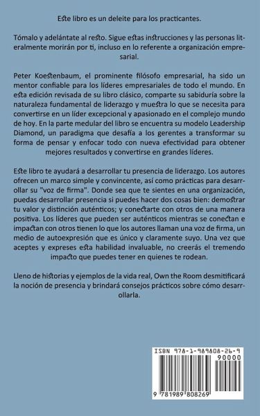 Este libro es un deleite para los practicantes. Tómalo y adelántate al resto. Sigue estas instrucciones y las personas literalmente morirán por ti, incluso en lo referente a organización empresarial. Peter Koestenbaum, el prominente filósofo empresarial, ha sido un mentor confiable para los líderes empresariales de todo el mundo. En esta edición revisada de su libro clásico, comparte su sabiduría sobre la naturaleza fundamental de liderazgo y muestra lo que se necesita para convertirse en un líder excepcional y apasionado en el complejo mundo de hoy. En la parte medular del libro se encuentra su modelo Leadership Diamond, un paradigma que desafía a los gerentes a transformar su forma de pensar y enfocar todo con nueva efectividad para obtener mejores resultados y convertirse en grandes líderes. Este libro te ayudará a desarrollar tu presencia de liderazgo. Los autores ofrecen un marco simple y convincente, así como prácticas para desarrollar su "voz de firma". Donde sea que te sientes en una organización, puedas desarrollar presencia si puedes hacer dos cosas bien: demostrar tu valor y distinción auténticos; y conectarte con otros de una manera positiva. Los líderes que pueden ser auténticos mientras se conectan e impactan con otros tienen lo que los autores llaman una voz de firma, un medio de autoexpresión que es único y claramente suyo. Una vez que aceptes y expreses esta habilidad invaluable, no creerás el tremendo impacto que puedes tener en quienes te rodean. Lleno de historias y ejemplos de la vida real, Own the Room desmitificará la noción de presencia y brindará consejos prácticos sobre cómo desarrollarla.