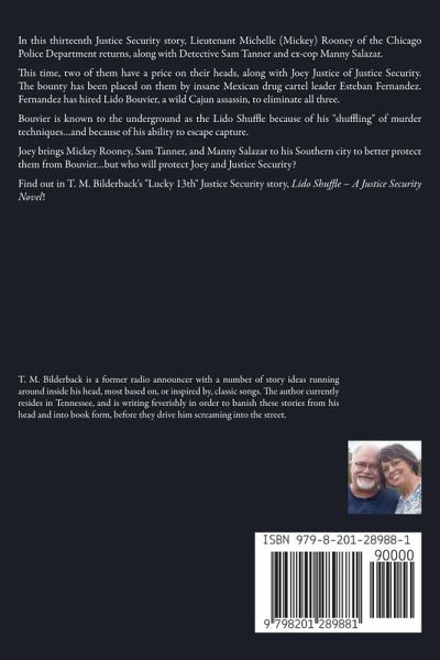 In this thirteenth Justice Security story, Lieutenant Michelle (Mickey) Rooney of the Chicago Police Department returns, along with Detective Sam Tanner and ex-cop Manny Salazar. This time, two of them have a price on their heads, along with Joey Justice of Justice Security. The bounty has been placed on them by insane Mexican drug cartel leader Esteban Fernandez. Fernandez has hired Lido Bouvier, a wild Cajun assassin, to eliminate all three. Bouvier is known to the underground as the Lido Shuffle because of his "shuffling" of murder techniques...and because of his ability to escape capture. Joey brings Mickey Rooney, Sam Tanner, and Manny Salazar to his Southern city to better protect them from Bouvier...but who will protect Joey and Justice Security? Find out in T. M. Bilderback's "Lucky 13th" Justice Security story, Lido Shuffle - A Justice Security Novel!