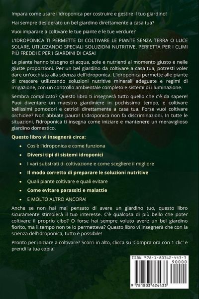 Impara come usare l'idroponica per costruire e gestire il tuo giardino! Hai sempre desiderato un bel giardino direttamente a casa tua? Vuoi imparare a coltivare le tue piante e le tue verdure? L'IDROPONICA TI PERMETTE DI COLTIVARE LE PIANTE SENZA TERRA O LUCE SOLARE, UTILIZZANDO SPECIALI SOLUZIONI NUTRITIVE. PERFETTA PER I CLIMI PIÙ FREDDI E PER I GIARDINI DI CASA! Le piante hanno bisogno di acqua, sole e nutrienti al momento giusto e nelle giuste proporzioni. Per un bel giardino da coltivare a casa tua, potresti voler dare un'occhiata alla scienza dell'idroponica. L'idroponica permette alle piante di crescere utilizzando soluzioni nutritive minerali adeguate e regimi di irrigazione, con un controllo ambientale completo e sistemi di illuminazione. Sembra complicato? Questo libro ti insegnerà tutto quello che c'è da sapere! Puoi diventare un maestro giardiniere in pochissimo tempo, e coltivare bellissimi pomodori e cetrioli direttamente a casa tua. Forse vuoi coltivare orchidee? Non abbiate paura! L'idroponica non fa discriminazioni. In tutte le situazioni, l'idroponica ti insegna come iniziare e mantenere un meraviglioso giardino domestico. Questo libro vi insegnerà circa: - Cos'è l'idroponica e come funziona - Diversi tipi di sistemi idroponici - I vari substrati di coltivazione e come scegliere il migliore - Il modo corretto di preparare le soluzioni nutritive - Quali piante coltivare e quali evitare - Come evitare parassiti e malattie - E MOLTO ALTRO ANCORA! Anche se non hai mai pensato di avere un giardino tuo, questo libro sicuramente stimolerà il tuo interesse. C'è qualcosa di più bello che poter coltivare il proprio cibo? O forse hai sempre voluto avere un bel giardino fiorito, ma il tempo non te lo permetteva? Questo libro vi insegnerà che con la scienza dell'idroponica, tutto è possibile!
