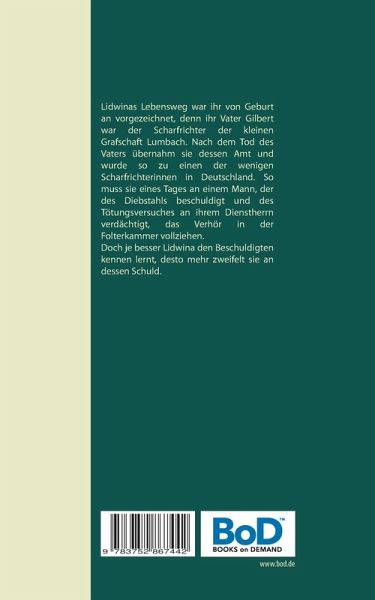 Lidwinas Lebensweg war ihr von Geburt an vorgezeichnet, denn ihr Vater Gilbert war der Scharfrichter der kleinen Grafschaft Lumbach. Nach dem Tod des Vaters übernahm sie dessen Amt und wurde so zu einen der wenigen Scharfrichterinnen in Deutschland. So muss sie eines Tages an einem Mann, der des Diebstahls beschuldigt und des Tötungsversuches an ihrem Dienstherrn verdächtigt, das Verhör in der Folterkammer vollziehen.Doch je besser Lidwina den Beschuldigten kennen lernt, desto mehr zweifelt sie an dessen Schuld.