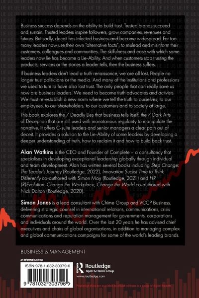 This book explores the 7 Deadly Lies that business tells itself, the 7 Dark Arts of Deception that are still used with monotonous regularity to manipulate the narrative. It offers C-suite leaders and senior managers a clear path out of deceit. It provides a solution to the Lie-Ability of some leaders by developing a deeper understanding of truth, how to reclaim it and how to build back trust.