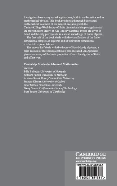 Lie algebras have many varied applications, both in mathematics and mathematical physics. This book provides a thorough but relaxed mathematical treatment of the subject, including both the Cartan-Killing-Weyl theory of finite dimensional simple algebras and the more modern theory of Kac-Moody algebras. Proofs are given in detail and the only prerequisite is a sound knowledge of linear algebra. The Appendix provides a summary of the basic properties of each Lie algebra of finite and affine type.