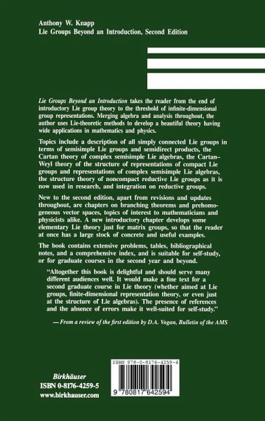 "Anthony Knapp's Lie Groups Beyond an Introduction, 2nd edition, is a beautiful introduction to this area of mathematics, appropriate for a variety different audiences.... The book is well-organized with concise, focused introductions to each chapter, a very thorough index of notation, and appendices.... In addition, there are hints to the hundreds of exercises, and a section on historical notes.... Knapp's writing is clear, and he avoids excessive notation. The first few chapters comprise a standard introductory course in Lie theory, while numerous second courses could be taught out of the later chapters. Its breadth of coverage and extensive tables also make the book a valuable reference for researchers in representation theory." -MAA Reviews (review of the second edition)