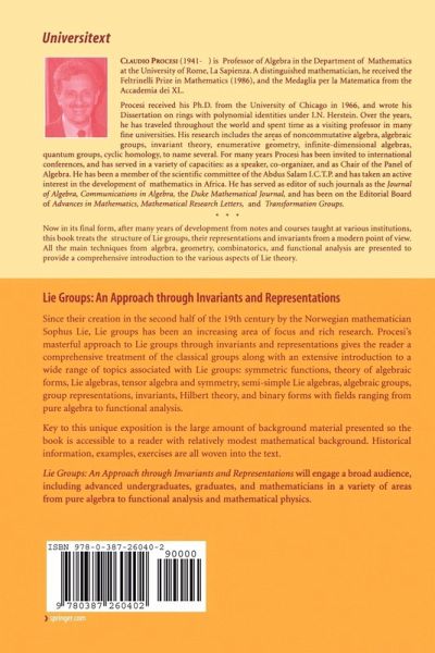Lie groups has been an increasing area of focus and rich research since the middle of the 20th century. Procesi's masterful approach to Lie groups through invariants and representations gives the reader a comprehensive treatment of the classical groups along with an extensive introduction to a wide range of topics associated with Lie groups: symmetric functions, theory of algebraic forms, Lie algebras, tensor algebra and symmetry, semisimple Lie algebras, algebraic groups, group representations, invariants, Hilbert theory, and binary forms with fields ranging from pure algebra to functional analysis.