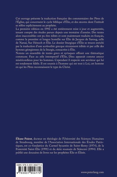 Cet ouvrage présente la traduction française des commentaires des Pères de l'Église, qui concernent le cycle biblique d'Élie, et des oeuvres dont l'intitulé se réfère explicitement au prophète. La première édition en 1992 a été entièrement mise à jour et augmentée, tenant compte des études parues dans la trentaine d'années passées.