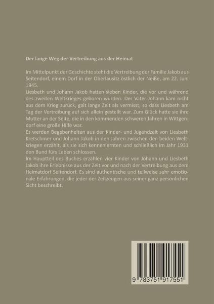 Der lange Weg der Vertreibung aus der HeimatIm Mittelpunkt der Geschichte steht die Vertreibung der Familie Jakob aus Seitendorf, einem Dorf in der Oberlausitz östlich der Neiße, am 22. Juni 1945. Liesbeth und Johann Jakob hatten sieben Kinder, die vor und während des zweiten Weltkrieges geboren wurden. Der Vater Johann kam nicht aus dem Krieg zurück, galt lange Zeit als vermisst, so dass Liesbeth am Tag der Vertreibung auf sich allein gestellt war. Zum Glück hatte sie ihre Mutter an der Seite, die in den kommenden schweren Jahren in Wittgendorf eine große Hilfe war.Es werden Begebenheiten aus der Kinder- und Jugendzeit von Liesbeth Kretschmer und Johann Jakob in den Jahren zwischen den beiden Weltkriegen erzählt, als sie sich kennenlernten und schließlich im Jahr 1931 den Bund fürs Leben schlossen.Im Hauptteil des Buches erzählen vier Kinder von Johann und Liesbeth Jakob ihre Erlebnisse aus der Zeit vor und nach der Vertreibung aus dem Heimatdorf Seitendorf. Es sind authentischeund teilweise sehr emotionale Erfahrungen, die jeder der Zeitzeugen aus seiner ganz persönlichen Sicht beschreibt.