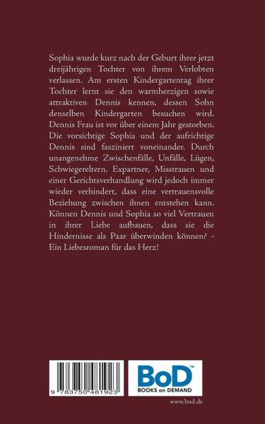 Sophia wurde kurz nach der Geburt ihrer jetzt dreijährigen Tochter von ihrem Verlobten verlassen. Am ersten Kindergartentag ihrer Tochter lernt sie den warmherzigen sowie attraktiven Dennis kennen, dessen Sohn denselben Kindergarten besuchen wird. Dennis Frau ist vor über einem Jahr gestorben. Die vorsichtige Sophia und der aufrichtige Dennis sind fasziniert voneinander. Durch unangenehme Zwischenfälle, Unfälle, Lügen, Schwiegereltern, Expartner, Misstrauen und einer Gerichtsverhandlung wird jedoch immer wieder verhindert, dass eine vertrauensvolle Beziehung zwischen ihnen entstehen kann. Können Dennis und Sophia so viel Vertrauen in ihrer Liebe aufbauen, dass sie die Hindernisse als Paar überwinden können? - Ein Liebesroman für das Herz!