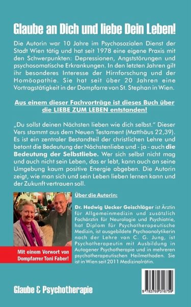 Glaube an Dich und liebe Dein Leben! Die Autorin zeigt, wie man sich und sein Leben lieben lernen kann und der Zukunft vertrauen soll. "Du sollst deinen Nächsten lieben wie dich selbst." Dieser Vers stammt aus dem Neuen Testament (Matthäus 22,39). Es ist ein zentraler Bestandteil der christlichen Lehre und betont die Bedeutung der Nächstenliebe und - ja - auch die Bedeutung der Selbstliebe. Wer sich selbst nicht mag und auch nicht sein Leben, das er lebt, kann auch an seine Umgebung kaum positive Energie abgeben.