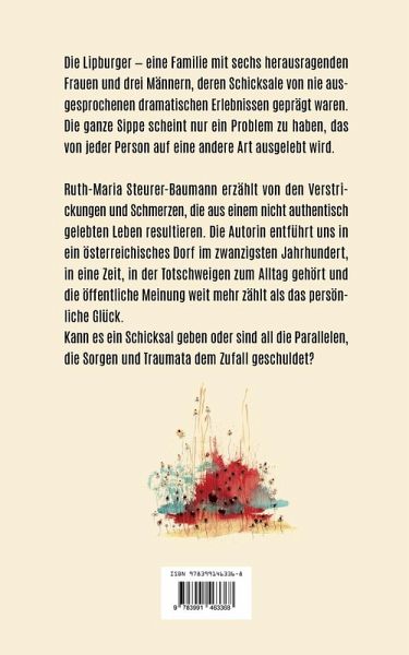 Die Lipburger - eine Familie mit sechs herausragenden Frauen und drei Männern, deren Schicksale von nie ausgesprochenen dramatischen Erlebnissen geprägt waren. Die ganze Sippe scheint nur ein Problem zu haben, das von jeder Person auf eine andere Art ausgelebt wird. Ruth-Maria Steurer-Baumann erzählt von den Verstrickungen und Schmerzen, die aus einem nicht authentisch gelebten Leben resultieren. Die Autorin entführt uns in ein österreichisches Dorf im zwanzigsten Jahrhundert, in eine Zeit, in der Totschweigen zum Alltag gehört und die öffentliche Meinung weit mehr zählt als das persönliche Glück. Kann es ein Schicksal geben oder sind all die Parallelen, die Sorgen und Traumata dem Zufall geschuldet?