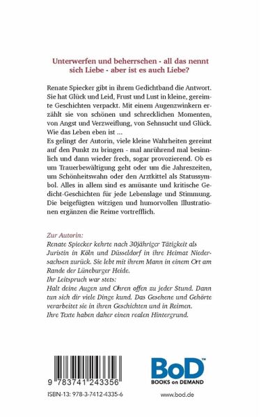 Unterwerfen und beherrschen - all das nennt sich Liebe - aber ist es auch Liebe?Renate Spiecker gibt in ihrem Gedichtband die Antwort. Sie hat Glück und Leid, Frust und Lust in kleine, gereimte Geschichten verpackt. Mit einem Augenzwinkern erzählt sie von schönen und schrecklichen Momenten, von Angst und Verzweiflung, von Sehnsucht und Glück. Wie das Leben eben ist... Es gelingt der Autorin, viele kleine Wahrheiten gereimt auf den Punkt zu bringen - mal anrührend mal besinnlich und dann wieder frech, sogar provozierend. Ob es um Trauerbewältigung geht oder um die Jahreszeiten, um Schönheitswahn oder den Arztkittel als Statussymbol. Alles in allem sind es amüsante und kritische Gedicht-Geschichten für jede Lebenslage und Stimmung. Die beigefügten witzigen und humorvollen Illustrationen ergänzen die Reime vortrefflich.
