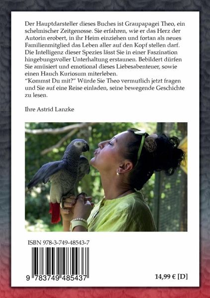 Der Hauptdarsteller dieses Buches ist Graupapagei Theo, ein schelmischer Zeitgenosse.Sie erfahren, wie er das Herz der Autorin erobert, in ihr Heim einziehen und fortan als neues Familienmitglied das Leben aller auf den Kopf stellen darf. Die Intelligenz dieser Spezies lässt Sie in einer Faszination hingebungsvoller Unterhaltung erstaunen. Bebildert dürfen Sie amüsiert und emotional dieses Liebesabenteuer, sowie einen Hauch Kuriosum miterleben. "Kommst Du mit?" Würde Sie Theo vermutlich jetzt fragen und Sie auf eine Reise einladen, seine bewegende Geschichte zu lesen.Ihre Astrid Lanzke