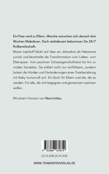 Ein Paar wird zu Eltern. Manche wünschen sich danach drei Wochen Malediven. Doch stattdessen bekommen Sie 24/7 Rufbereitschaft. Maren Leerhoff blickt auf über ein Jahrzehnt als Hebamme zurück und beschreibt die Transformation vom Liebes- zum Elternpaar. Vom positiven Schwangerschaftstest bis hin zu müden Sexdates. Sie erklärt nicht nur einfühlsam, sondern lockert die Hürden und Veränderungen einer Paarbeziehung mit Baby humorvoll auf. Ein Buch für Eltern und die, die es werden. Für alle, die sich begegnen und gemeinsam wachsen wollen.