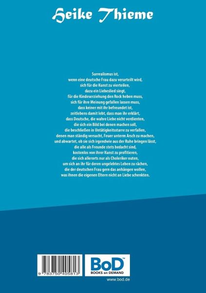 Surrealismus ist,wenn eine deutsche Frau dazu verurteilt wird,sich für die Kunst zu vierteilen, dazu ein Liebeslied singt,für die Kindeserziehung den Rock heben muss,sich für ihre Meinung gefallen lassen muss,dass keiner mit ihr befreundet ist,zeitlebens damit lebt, dass man ihr erklärt,dass Deutsche, die wahre Liebe nicht verdienten,die sich ein Bild bei denen machen soll,die beschließen in Untätigkeitsstarre zu verfallen,denen man ständig versucht, Feuer unterm Arsch zu machen,und abwartet, ob sie sich irgendwie aus der Ruhe bringen lässt,die alle als Freunde stets bedacht sind,kostenlos von ihrer Kunst zu profitieren,die sich allerorts nur als Choleriker outen,um sich an ihr für deren ungelebtes Leben zu rächen,die der deutschen Frau gern das anhängen wollen,was ihnen die eigenen Eltern nicht an Liebe schenkten.